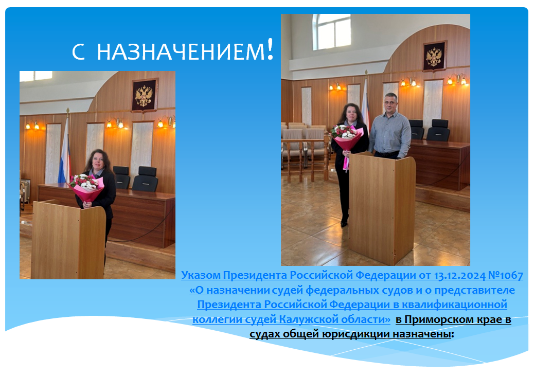 Российской Федерации от 13.12.2024 №1067 Дайнеко Ксения Борисовна и Маслаков Евгений Петрович - судьями Фрунзенского районного суда г. Владивостока На фото: поздравление заместителя председателя Приморского краевого суда А.А. Гончарова со вступлением О.Е. Анциферовой в должность заместителя председателя Первомайского районного суда г. Владивостока ![]() |